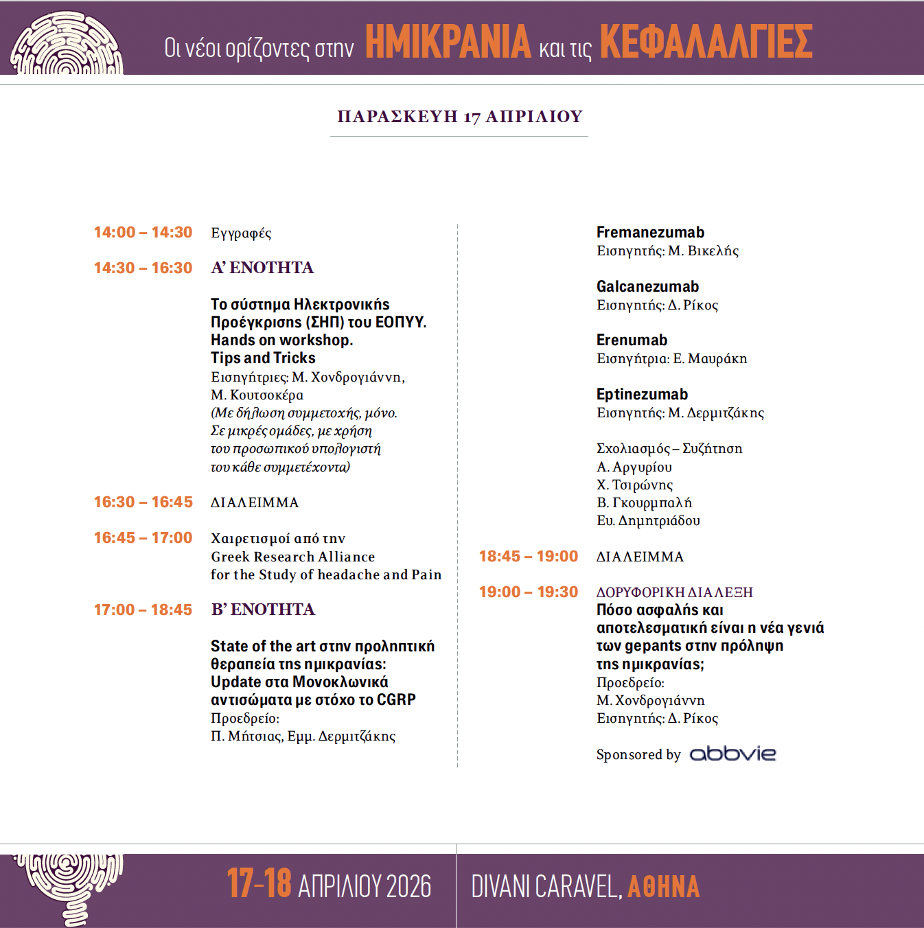 The Greek Research Alliance for the Study of Headache and Pain organizes a two day seminar, in Athens, Greece, on 17-18 April, 2026. All aspects of migraine and updates in its treatment are cobered in this highly scientific program.